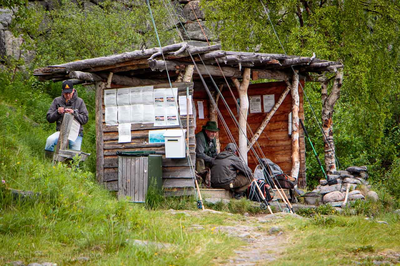 One of the main local pools on the Neiden is the Bridge pool just downstream of where we were staying, below a set of large falls/rapids and very popular with the locals and visitors alike. So much so that they have their own little hut for the anglers to chat and rig up while they await their turn down the river on the busier periods. A large back-eddy below the rapids is the obvious starting place with fish showing regularly, which then leads off into a series of pockets below in between the boulders and white water that lead gradually down to the calmer water beyond.